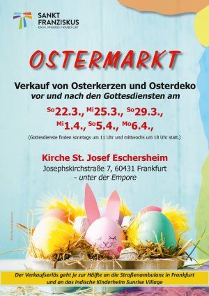 Rund um die Gottesdienste laden wir herzlich zum Ostermarkt in der Kirche St. Josef Eschersheim ein. Entdecken Sie liebevoll gestaltete Osterkerzen und kleine Dekorationen für die Osterzeit.